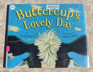 Buttercup's Lovely Day is a book of poems written from a cow's perspective! Age 2 is a little on the low end for this book that has beautiful and at times slightly complex language. Each poem begins with a line like "I love the sun" or "I love the creek" or "I love the man." It describes the cow's day and everything that she sees and smells. Lots of good sound words to describe the water in the creek and the winding paths, etc.